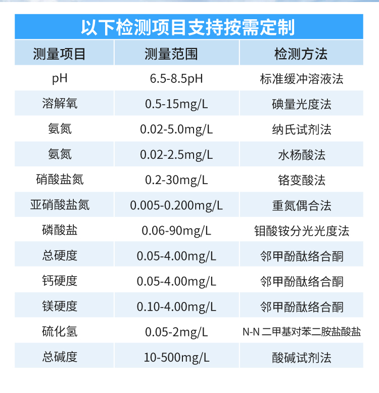 6. 測量項目:pH、溶解氧、氨氮、硝酸鹽氮、亞硝酸鹽氮、磷酸鹽、硫化氫、總硬度、鈣硬度、鎂硬度、總堿度、水溫、鹽度